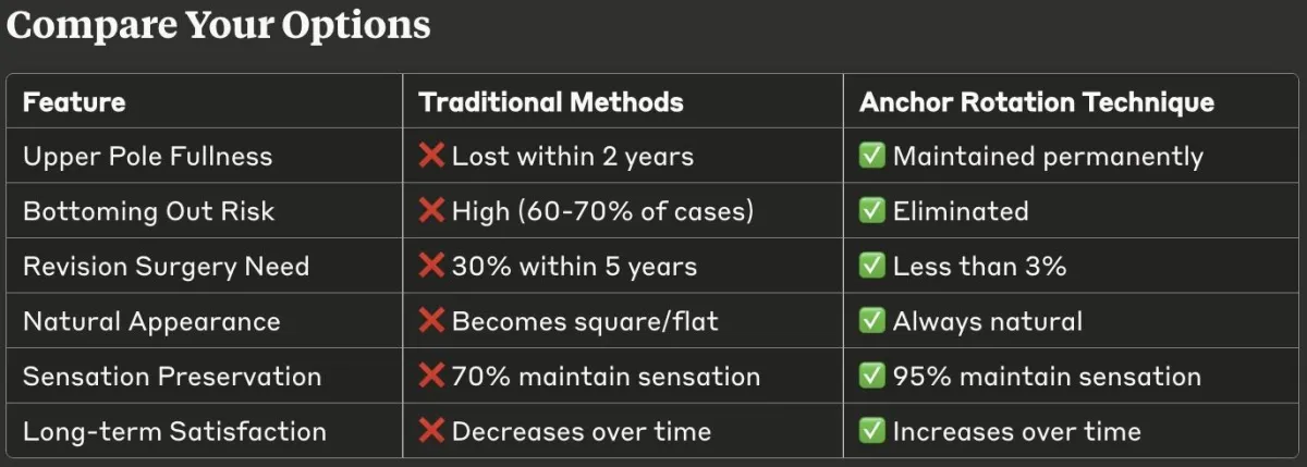The Anchor Rotation Technique doesn't just remove excess tissue - it fundamentally restructures the breast architecture to prevent long-term problems.